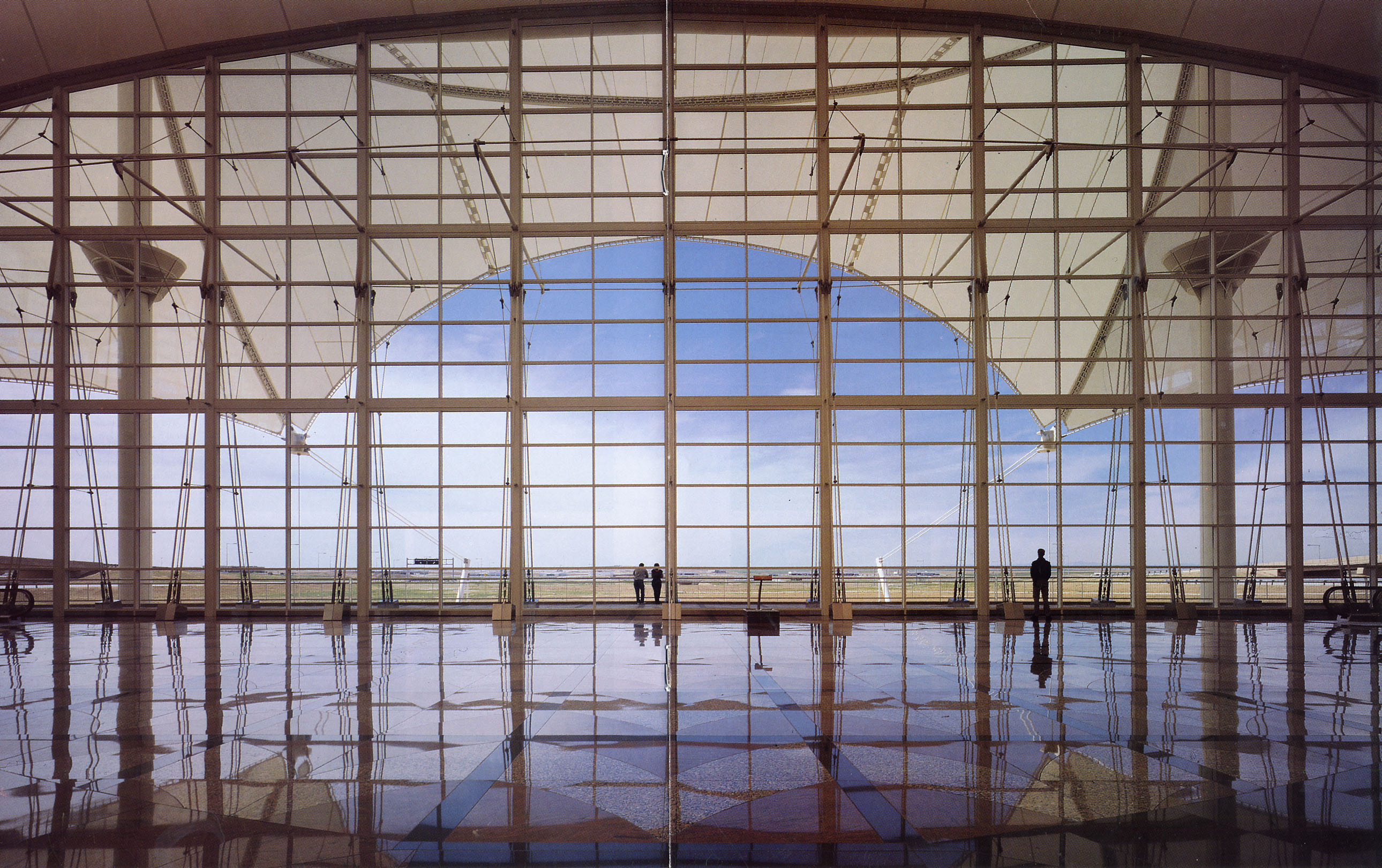 The airport’s most notable and acclaimed feature is the ultra-thin, PTFE-coated fiberglass fabric roof, which rises and falls in peaks and valleys that mimic the surrounding Rocky Mountains.  Severud Associates used sophisticated non-linear analysis software—developed in-house—to design a tensile membrane system consisting of an outer and inner layer.  The outer layer carries snow and wind loads while the inner layer creates an insulating air gap and diffuses light.
